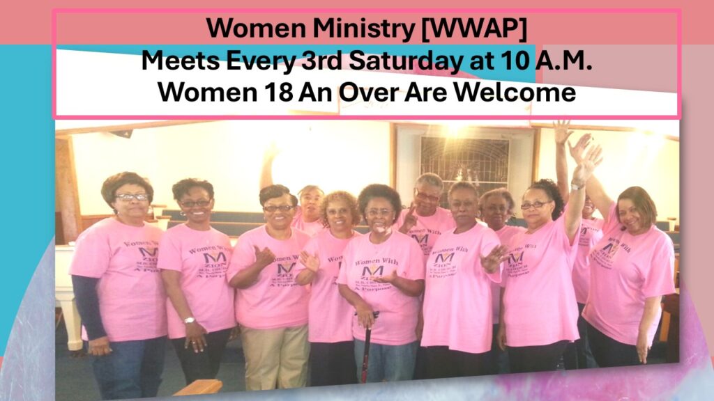 The Women’s Ministry of MT Zion Missionary Baptist Church provides fellowship, teaching, sharing, and prayer for women of all ages. Our goal is to promote sisterhood by cultivating life changing relationships, creating a safe environment to discuss issues that impact our lives, to grow in the knowledge of Jesus and to extend grace to other women.